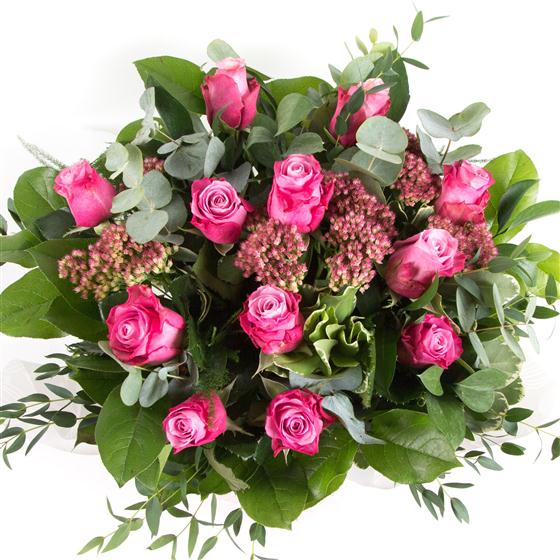A dozen classic long stemmed pink roses mingled with mixed foliage presented in water.