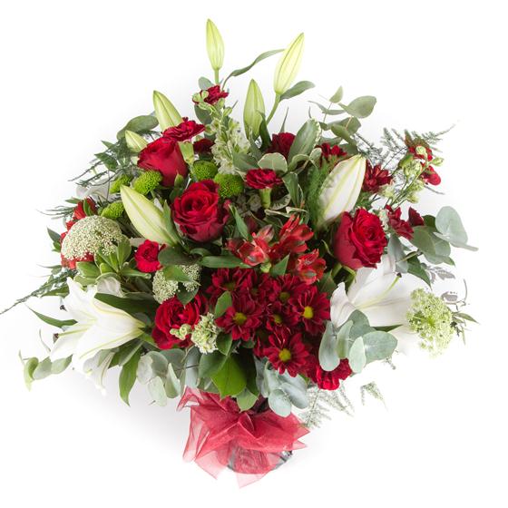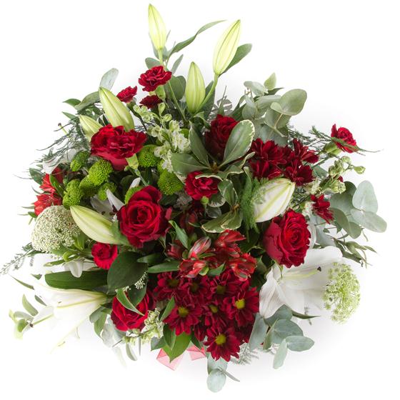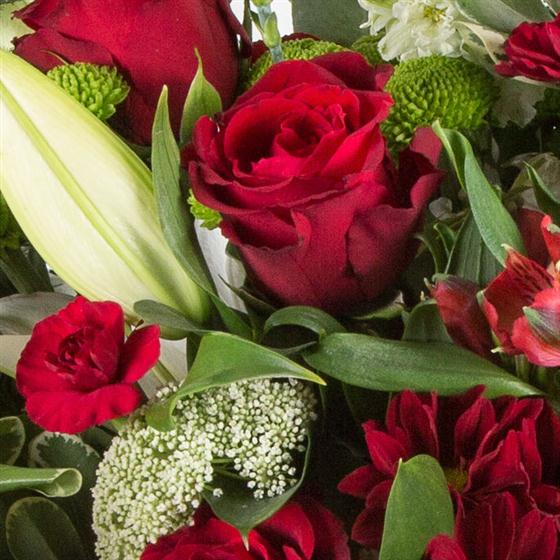 An exotic collection including red roses, oriental lilies with a variety of red and green blooms and foliage.