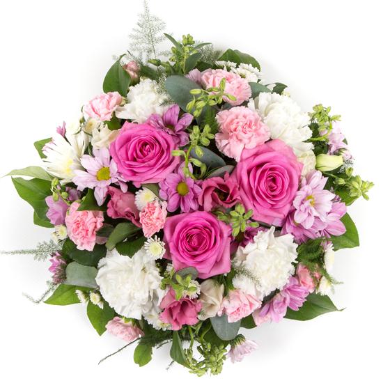 A compact posy arrangement created using seasonal flowers and foliage. Available in pink and cream as pictured or a range of different colours.