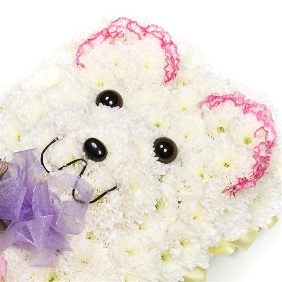 A small teddy bear tribute, measuring 19" (48cm) in height, available as pictured with a chrysanthemum base and complementing sprays in a range of delicate pastel shades.